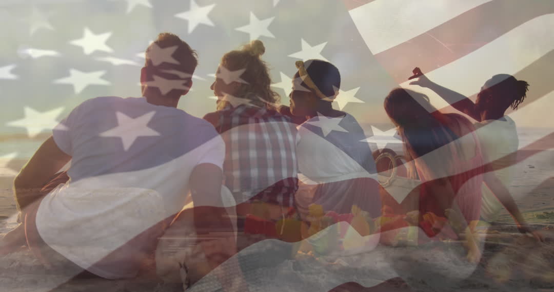 - Diverse Friends Enjoying Summer Beach with USA Flag Overlay