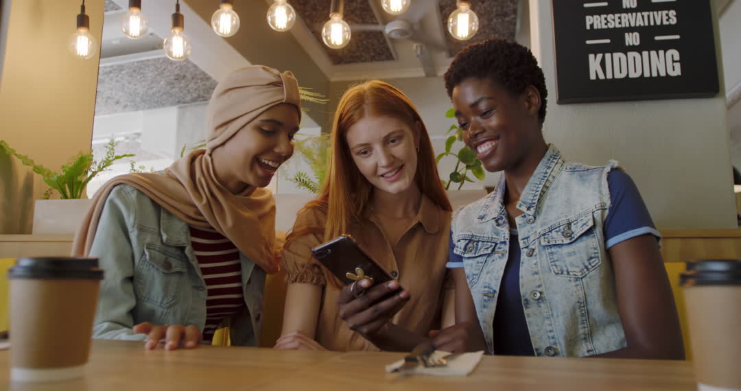 A group of diverse young women enjoying time together at a coffee shop while engaging with a smartphone. The scene captures multicultural friends fostering connection and technology use in a relaxed café environment. Suitable for concepts of friendship, diversity, culture, technology, and modern lifestyles. Ideal for marketing materials focusing on diversity, communities, and social experiences.