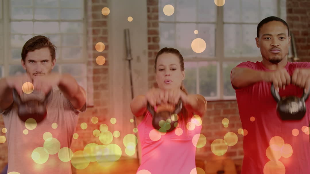 Diverse group of friends actively exercising with kettlebells at a gym, enhanced with animated glowing circles. Perfect for presentations focusing on teamwork, active lifestyles, and fitness environments. Ideal for health and wellness promotions, gym advertisements, and sports-oriented social media posts.