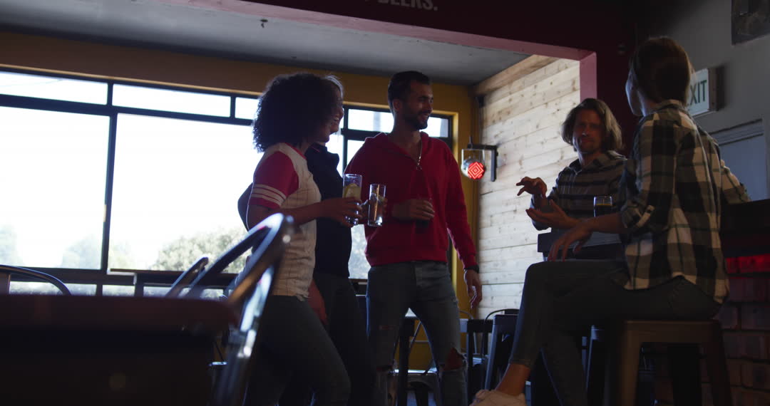- Diverse Friends Socializing Joyfully in Daylit Pub