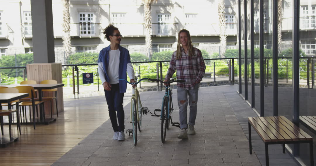 Two friends, engaged in conversation, leisurely walk with their bicycles along a modern city street. Suitable for illustrating concepts of eco-friendly living, urban leisure activities, and multicultural friendship. Perfect for use in promotions related to green transportation and social interactions in urban environments.