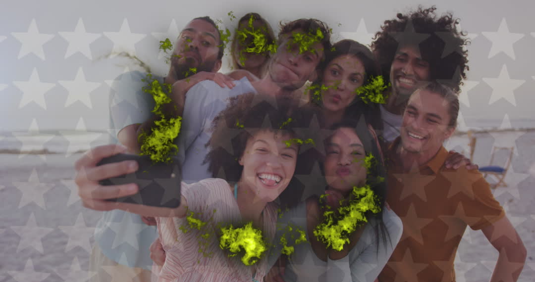 This visual captures a diverse group of friends enjoying a selfie on the beach, amidst Independence Day celebrations. It inspires feelings of joy, togetherness, and holiday spirit. Perfect for marketing materials about summer events, social media campaigns for the 4th of July, or fostering an inclusive celebration atmosphere.
