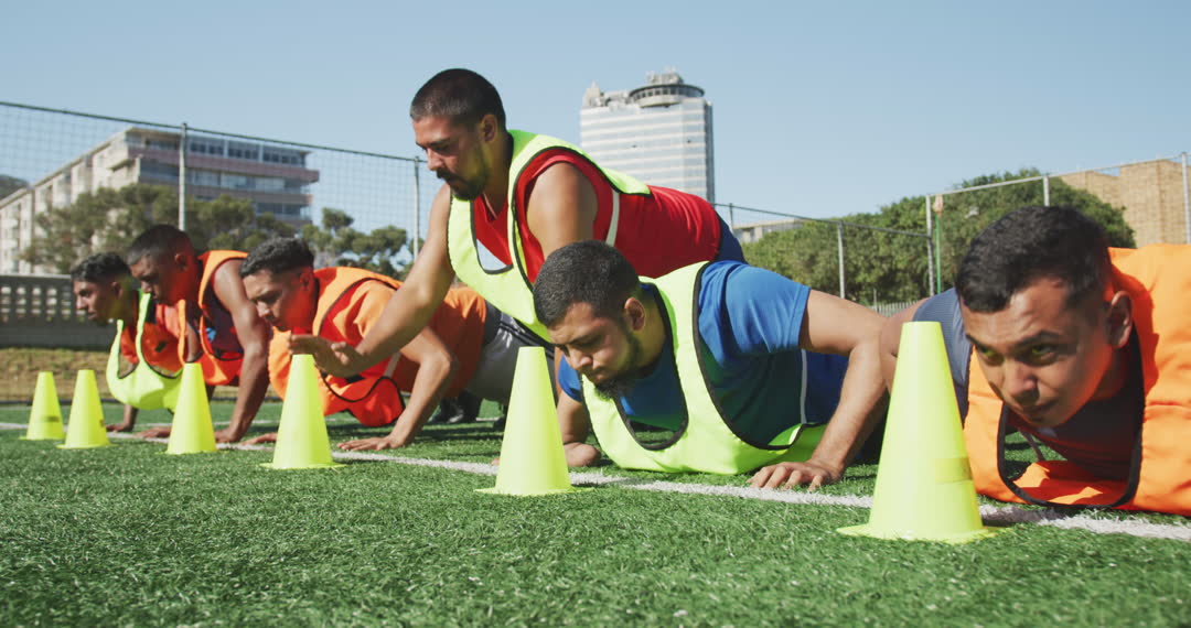 A dedicated group of male football players exercises on a field under the sun, showcasing teamwork and resilience. Engaged in a checklist training routine, each player focuses on touching cones as they complete their push-ups. Promoting themes of inclusivity and adaptability, use this visual for sports events marketing, inspirational campaigns, or articles on fitness and team building.