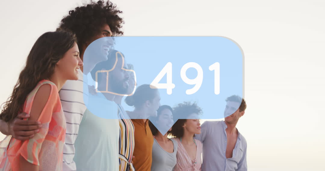 Group of diverse friends enjoying a moment together at the beach with a superimposed social media like count. This is perfect for themes exploring friendship, diversity, social networking, technology impact, or advertising messaging on online engagement and community building.