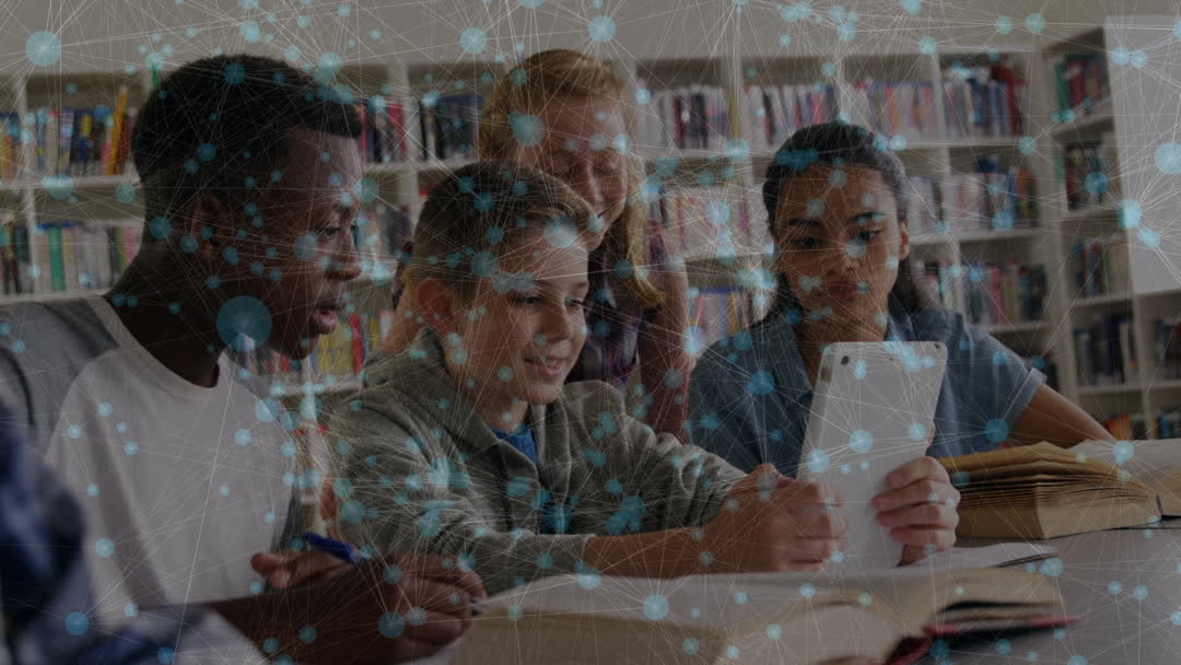 Diverse group of school students engaging in study session in library with interactive digital network overlay symbolizing global connectivity in education. Use in educational technology promotions, multicultural engagement initiatives, and learning resource advertisements.