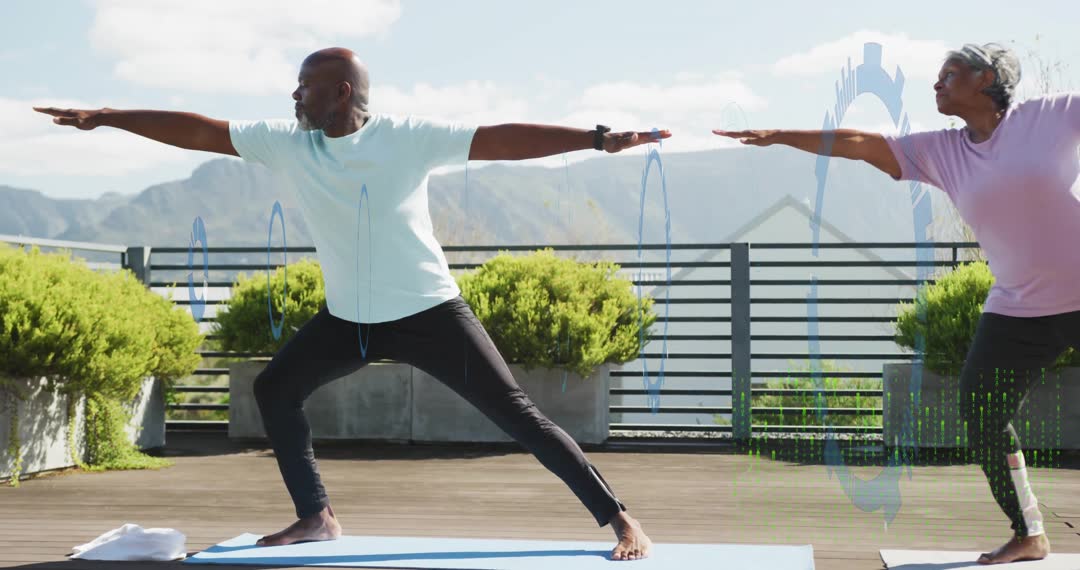 Two individuals practicing yoga on a rooftop with a serene backdrop of mountains. A digital health data animation overlays the scene, indicating technology integration in fitness routines. Suitable for promoting tech-driven wellness practices, urban fitness environments, or holistic health apps emphasizing modern exercise solutions.