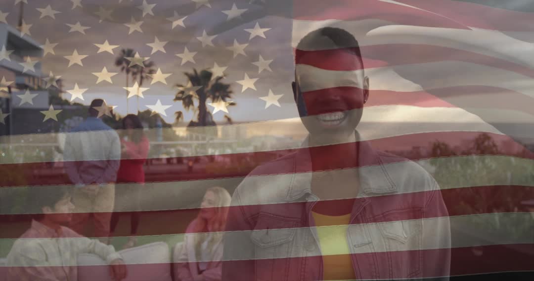 Diverse group of friends socializing on a rooftop during sunset with an overlay of the American flag, creating a warm and patriotic atmosphere. This can be used for content focusing on multicultural gatherings, social connections, lifestyle, or festivities.