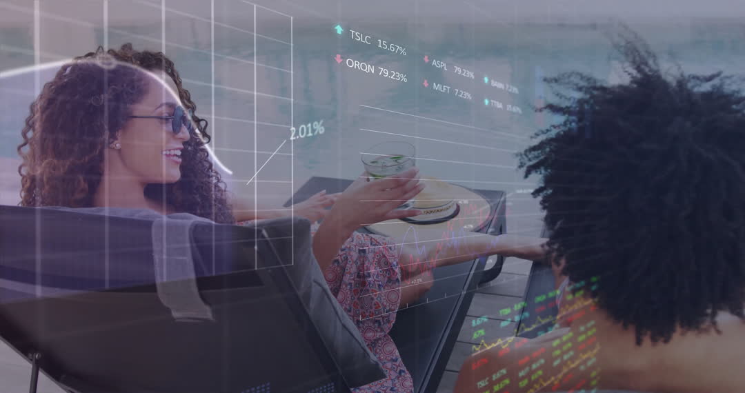 Depicts diverse group enjoying leisure time beside pool overlaying data charts. Useful for themes exploring digital nomad lifestyle, combination of relaxation and work, or highlighting modern multicultural experiences. Captures balance of enjoying pleasant outdoor day with technological undercurrent.