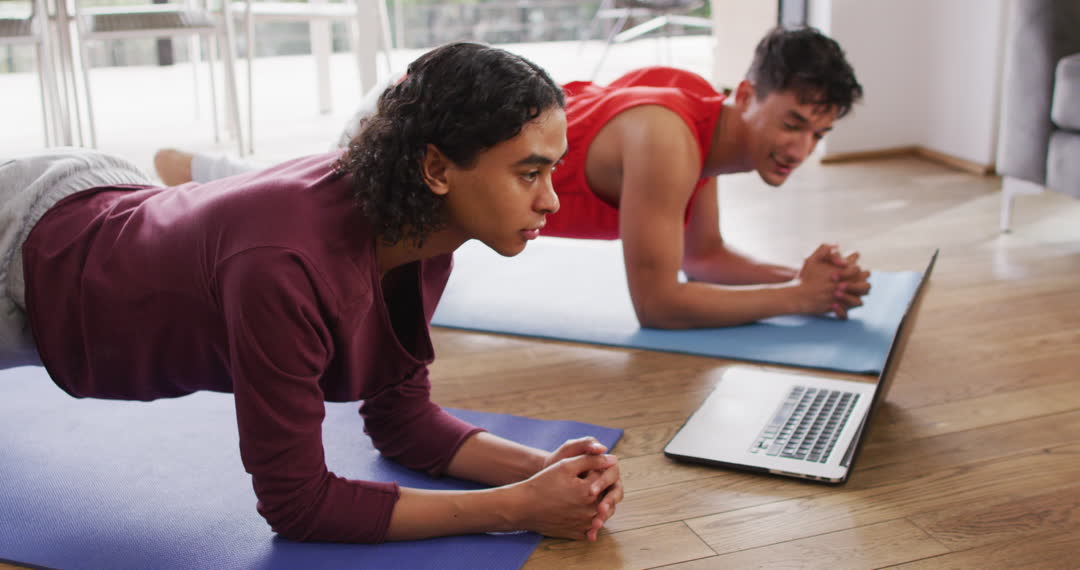 - Diverse Male Couple Exercise Together with Online Workouts at Home
