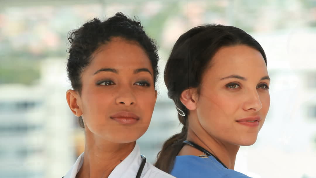 This video shows two healthcare professionals, with a visible cityscape in the background. These medical staff members standing in a bright, modern setting suggests a focus on community and dedicated healthcare service. Useful for promoting diversity in medical practices, advertising hospital services, or featuring in health-focused publications, it reflects teamwork, positivity, and modern healthcare relationships.