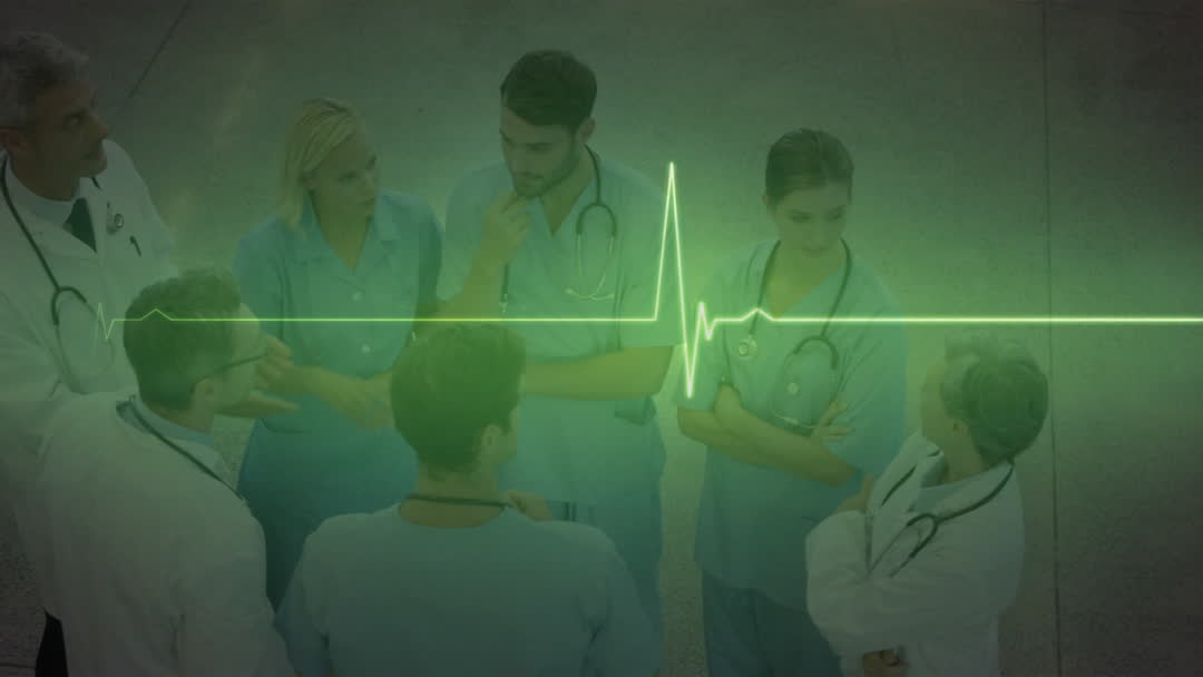 Diverse Medical Team Analyzing Data with ECG Overlay Video
