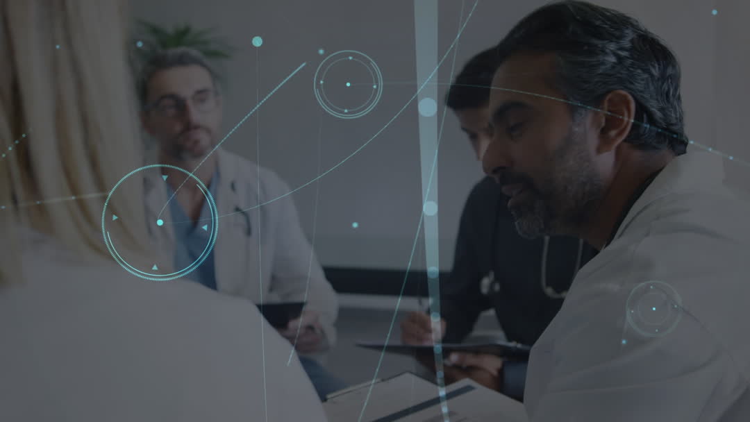 This animation shows a diverse group of doctors engaged in discussion with an overlay of digital networks and connections. Ideal for illustrating concepts related to teamwork in modern medicine, the integration of technology in healthcare, and collaboration in global health initiatives. Useful for websites and presentations focusing on healthcare innovation, digital health solutions, and medical research updates.