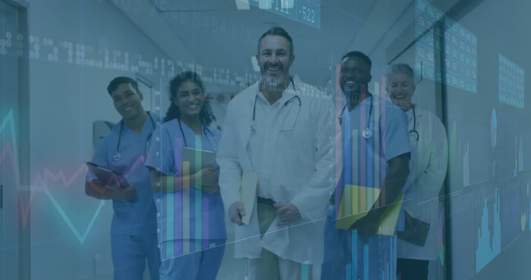 Hospital professionals standing in a corridor, symbolizing healthcare teamwork and the integration of technology through visible chart animations and digital icons. Showcases diversity and cooperation among medical staff, appealing for uses in healthcare marketing, medical publications, or technology-focused articles. Illustrates modernization of clinical practices and diagnostics in contemporary medicine.