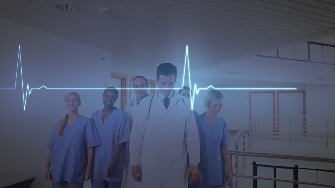 Diverse medical professionals walking with a digital heartbeat line overlay, showcasing the intersection of healthcare and advanced technology. Ideal for representing innovation in medicine and the collaborative nature of patient care. Suitable for use in healthcare promotion materials, education about medical technologies, and advertisements for medical services or digital innovation in healthcare.