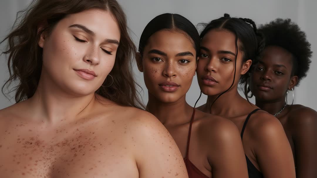 AI Generated Image. Video showing four multiracial women shifting heads slowly against gray background, wearing thin-strap tops, showcasing diverse skin tones, natural freckles, and varied body types. Soft even studio lighting highlighting skin texture and subtle makeup, tight framing on faces and shoulders creating intimate editorial feel. Movement remaining gentle, making clip ideal for slow-motion or frame-by-frame editing to emphasize expression and detail. Usage ideas: use for beauty campaigns, inclusive marketing, skincare and makeup ads, fashion editorials, casting reels, diversity and representation projects, website hero banners, social media reels, Instagram and TikTok content, online tutorials and product demos. Pair with ambient music and minimal motion graphics for modern brand storytelling. Recommended post-production: warm color grading, gentle skin retouching while preserving texture, optional split-screen or cutaway edits to showcase multiple models simultaneously.