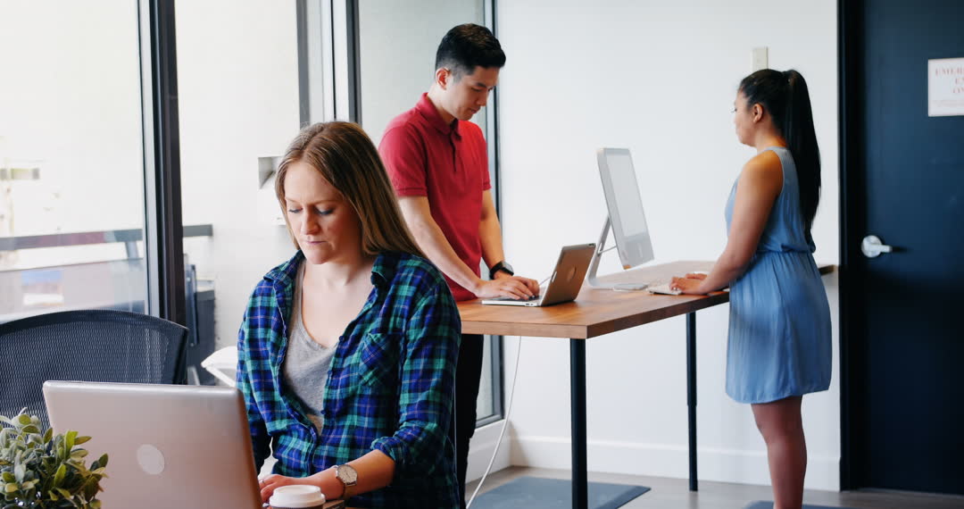 Modern office environment showcasing colleagues engaged in work tasks using technology. Ideal for depicting the use of varied work strategies such as standard sitting desks and standing workstations. Perfect for illustrating concepts like workplace diversity, tech-savvy environments, and collaborative dynamics in marketing materials, blogs, and educational content.
