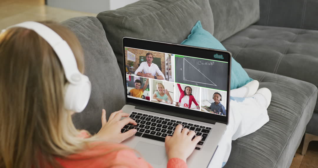Young student wearing headphones participates in a virtual classroom using a laptop. The screen displays a teacher and multiple students, suggesting an interactive and diverse learning environment. This scene captures the essence of modern, remote education, making it useful for content related to online schooling, remote communication, and tutorials on virtual learning platforms.