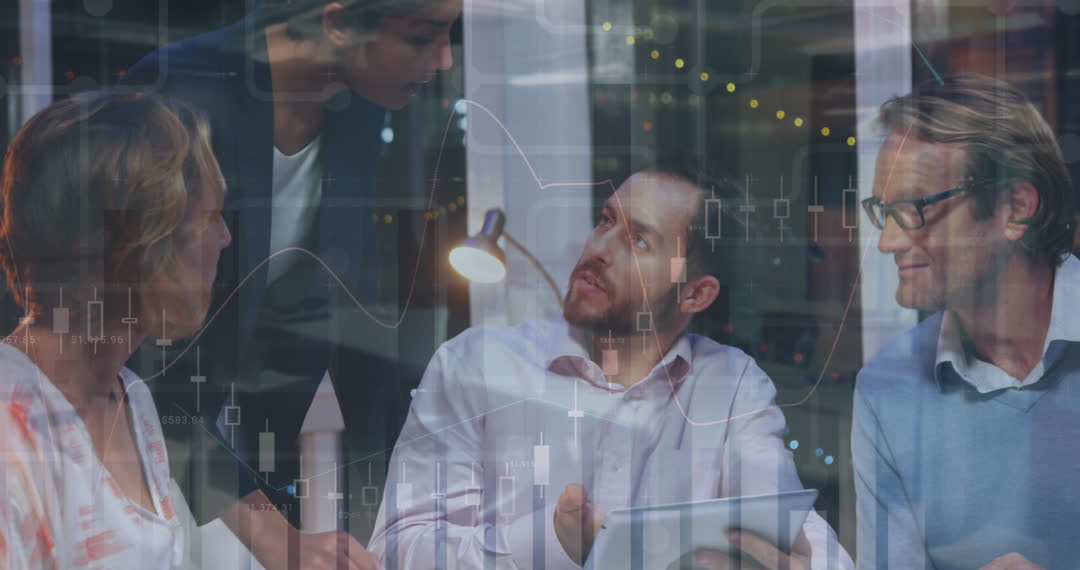 Four diverse business professionals engaging in discussion while analyzing digital data, depicted through overlaying graphs and charts, symbolizing teamwork, innovation, and modern business analysis. This visual can be used in content focused on technology-driven business strategies, team collaboration, or conveying concepts of digital transformation and data analytics in a global financial context.