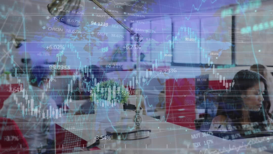 Visual combines dynamic animated financial data overlaying a bustling office scene with a diverse mix of business people. Useful for illustrating scenes of modern finance, teamwork, global economy discussions, or investment analysis. Ideal for marketing materials, educational content, or collaborative corporate environments.