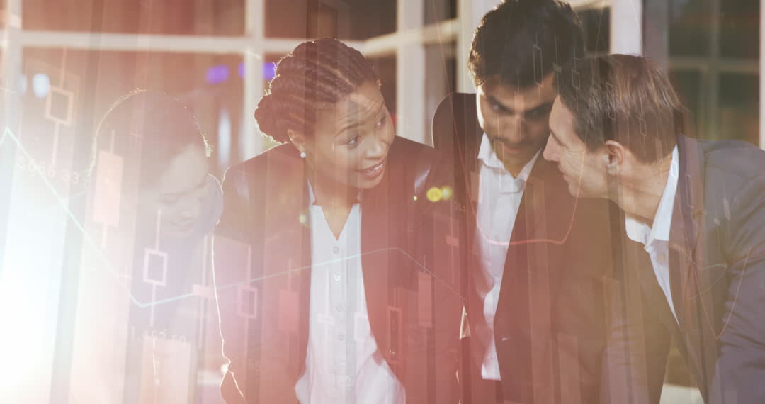 Group of professionals from diverse backgrounds gathering around a desk in office, analyzing graphical data overlays, symbolizing global business and collaboration. Suitable for representing teamwork, corporate strategy meetings, financial analysis, or advertisements for business solutions and consulting services.