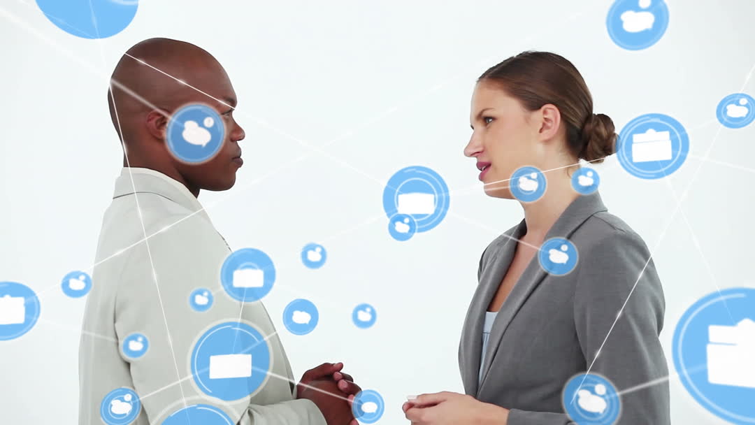 A businessman and businesswoman engaging in discussion surrounded by digital icons representing connectivity and technology. The widespread icons illustrate concepts of digital communication and global business networking. This visual can be effectively used for themes related to international collaborations, digital marketing, modern business solutions, or any corporate content focused on teamwork and technology.