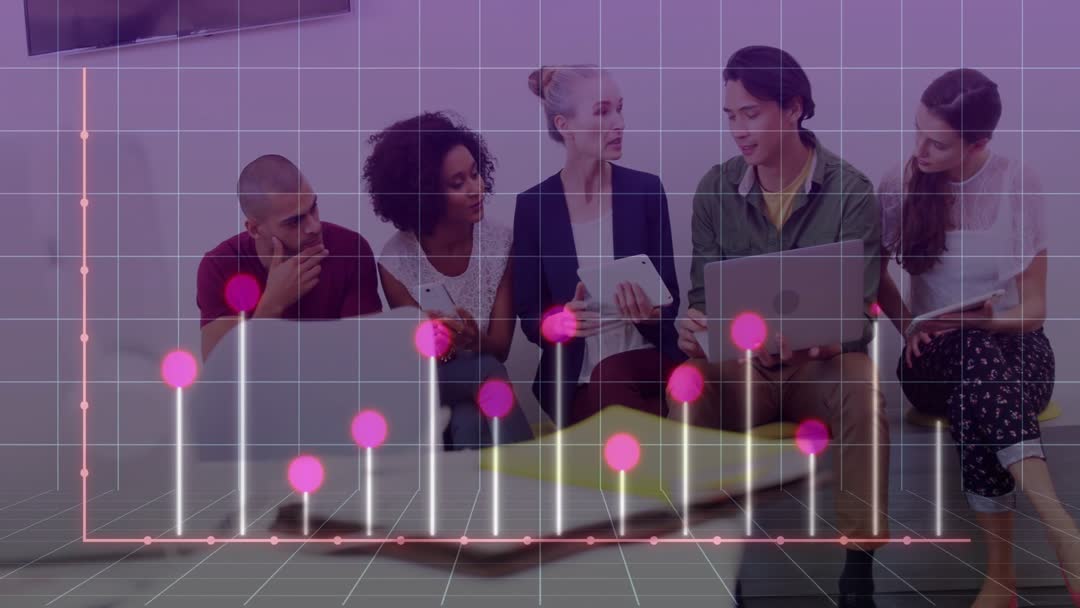 Diverse group of professionals gathered in a modern office lounge engaged in discussion over data presentation with 3D bar charts superimposed. Suitable for themes about effective teamwork, collaborative business environments, and driving innovation through analytics. This versatile video can enhance presentations, marketing materials, blog articles, and corporate communications focusing on digital business solutions and contemporary workspace dynamics.