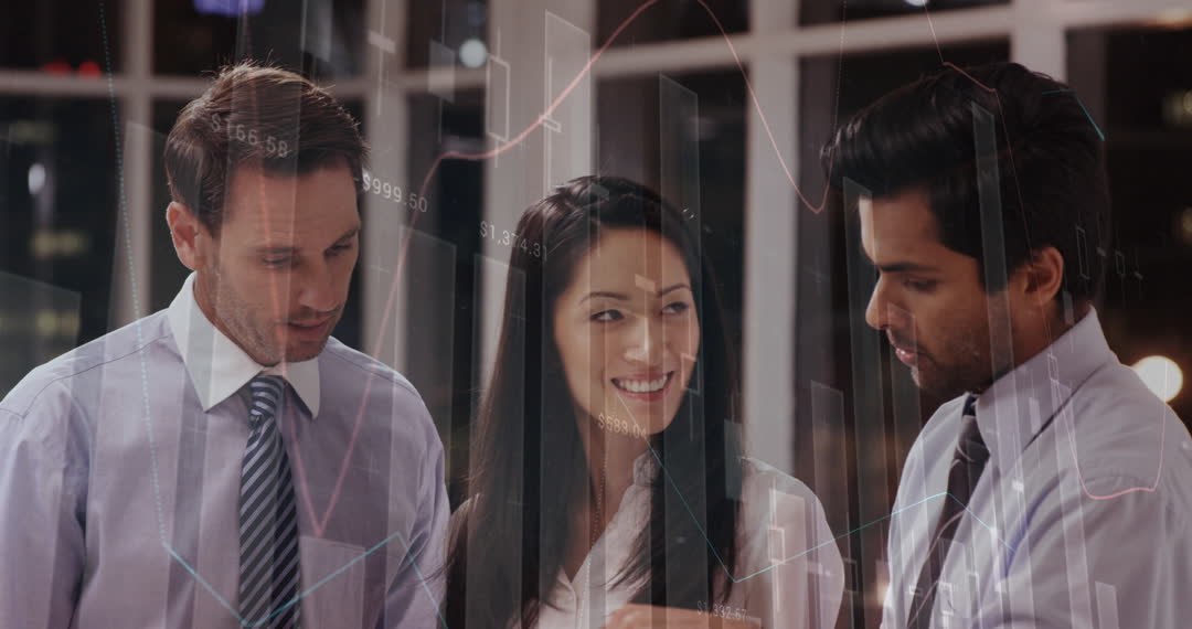 Business professionals from diverse ethnic backgrounds engage in a meeting, analyzing data with superimposed financial charts. This visual can be used to illustrate collaboration in corporate settings, presentations on technological advances in business, or discussions on data-driven decision making.