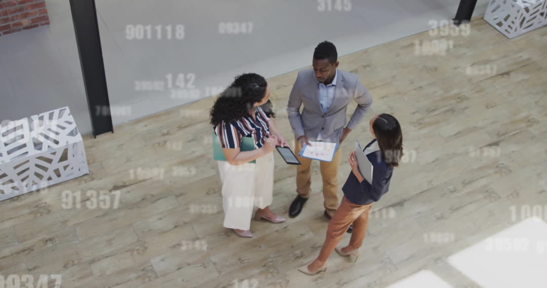 Top view of three business professionals in a trendy office, engaging in conversation with digital data presentations superimposed on the video, indicative of technology integration in business. Useful for topics on teamwork, digital transformation in workplaces, modern business environments, and inclusivity in professional settings.