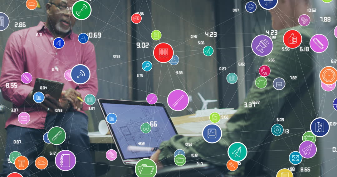 Diverse professionals engaged in a meeting with a focus on digital networking and technology solutions. Various colorful networking icons symbolize connectivity and data exchanges, highlighting themes of modern business communication, tech innovation, and collaborative environments. Ideal for use in articles or presentations about digital transformation, teamwork, and future workplace concepts.