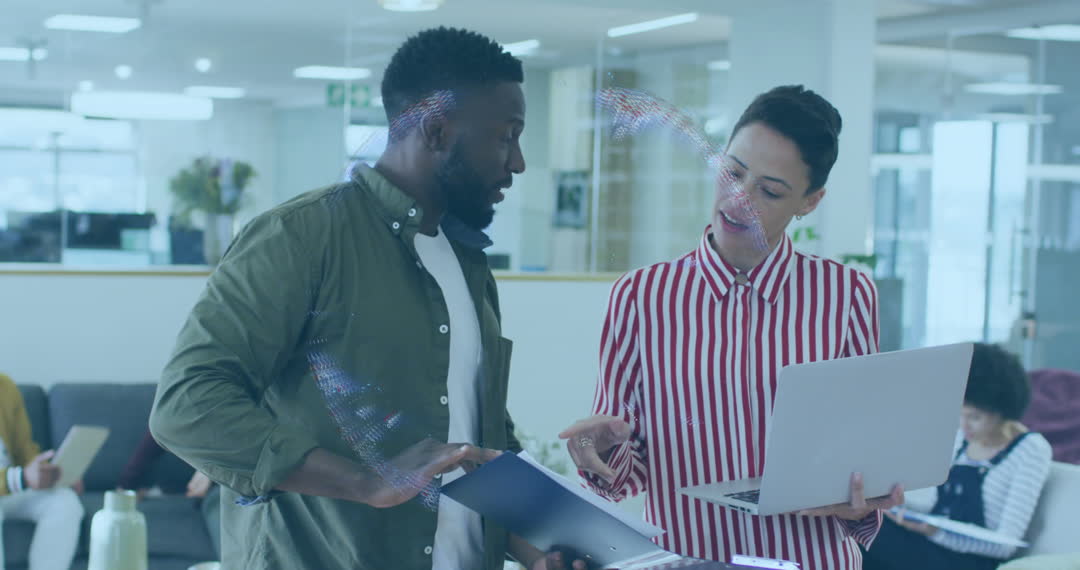 Two coworkers engage in discussion in modern office, holding laptop and digital files. Superimposed on the scene is an animated globe with network connections, indicating global business reach and digital strategy integration. Useful for concepts around digital transformation, team collaboration, diversity in workplace, or global networking strategies in business presentations or publications.