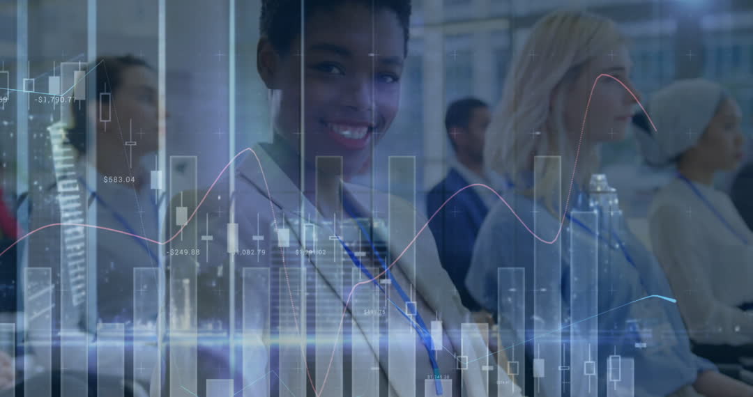 Diverse group of business professionals gathered at a conference, with an overlay of financial data graphics illustrating business analytics. Ideal for use in corporate presentations, financial service advertisements, or s-blog discussions on the impact of diversity in global finance and economic growth.