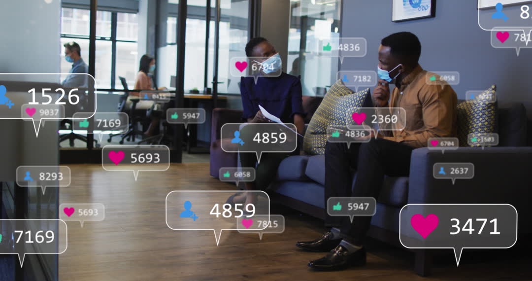 Two professionals wearing masks are engaging in a business discussion while digital social media icons float around, representing concepts like digital interaction and online engagement. This video is suitable for illustrating the blend of virtual engagement with real-world business communication. It is ideal for content about modern workplace trends, social media strategies, and business technology integration.