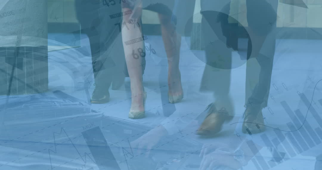 Layered visuals show diverse professionals moving through business space integrated with digital data processing and analytics. Suggests modern working environment dominated by technology and data-driven decisions. Ideal for use in presentations, articles, and blogs about digital transformation, business solutions, or future workplace trends.
