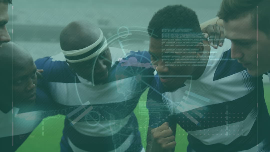 - Diverse Rugby Team Huddling with Sports Data Technology Overlay