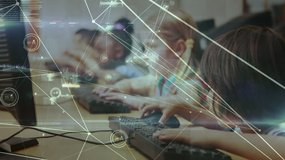 A close-up view of diverse schoolchildren interacting with computers overlaid by a digital network graphic. This visual represents modern education and technological advancement in classrooms. The video is ideal for illustrating concepts related to global connectivity, digital skills education, and the integration of technology in learning environments. It can be used for educational articles, technology blogs, and resources about child-friendly tech adaptations in schools.
