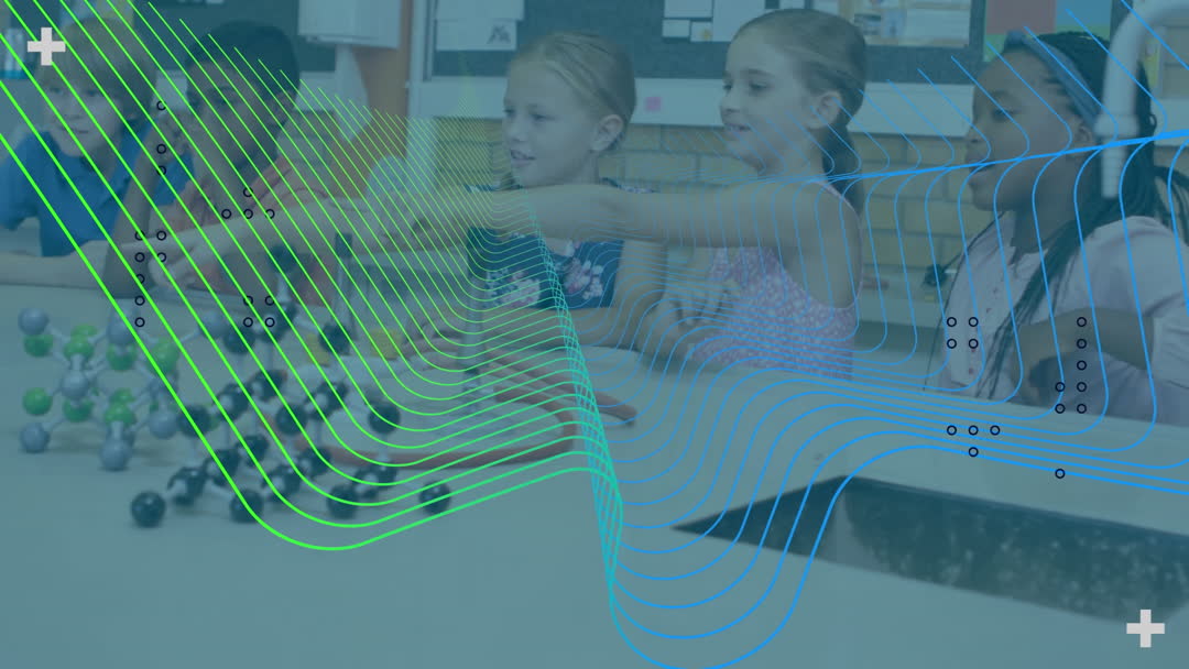 Diverse Schoolchildren Experimenting in Classroom with Overlay Video