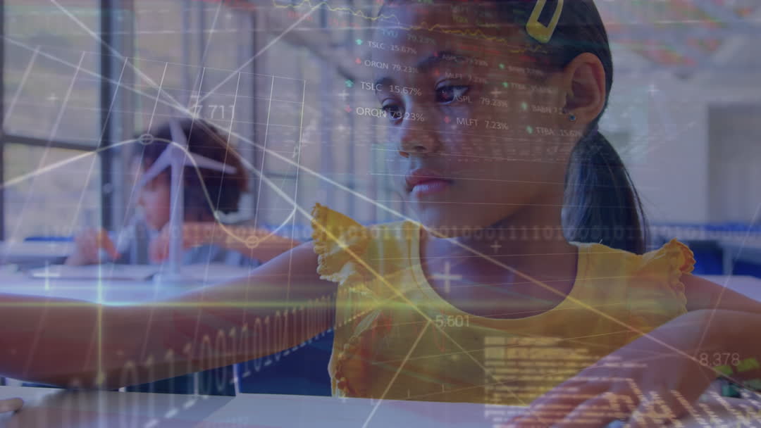 A young girl in a classroom environment surrounded by graphs and numerical data overlays, symbolizing the incorporation of digital technology and data assimilation in education. Her focused expression emphasizes the importance of integrating technology in learning environments to adapt to a modern educational curriculum. Suitable for illustrating advancements in educational technology, future learning techniques, or the impact of digital interfaces in schools.