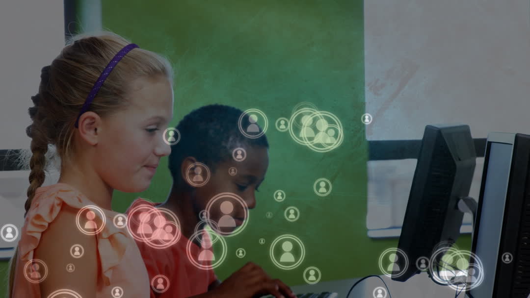 Diverse Schoolchildren Using Computers with Digital Connections Overlay Video