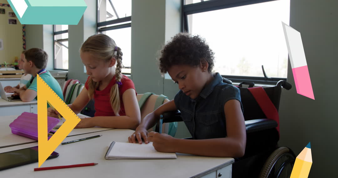 The video shows a diverse group of young students engaging in their studies within a classroom. A child using a wheelchair is attentively writing, symbolizing inclusion and accessibility in education. Brightly colored school-themed digital animations overlay the scene, adding a modern and dynamic element. This visual can be used to promote educational inclusivity, teamwork among students, or innovative approaches with tech integration in learning environments.