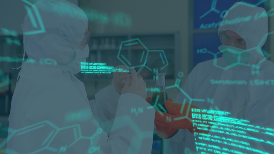 Two scientists in protective suits examining chemical compounds in a high-tech laboratory. Animated molecular structures overlay their work, indicating data processing and scientific analysis. Ideal for illustrating advanced chemistry research, scientific innovation, and data-driven analysis processes in academic or corporate environments.