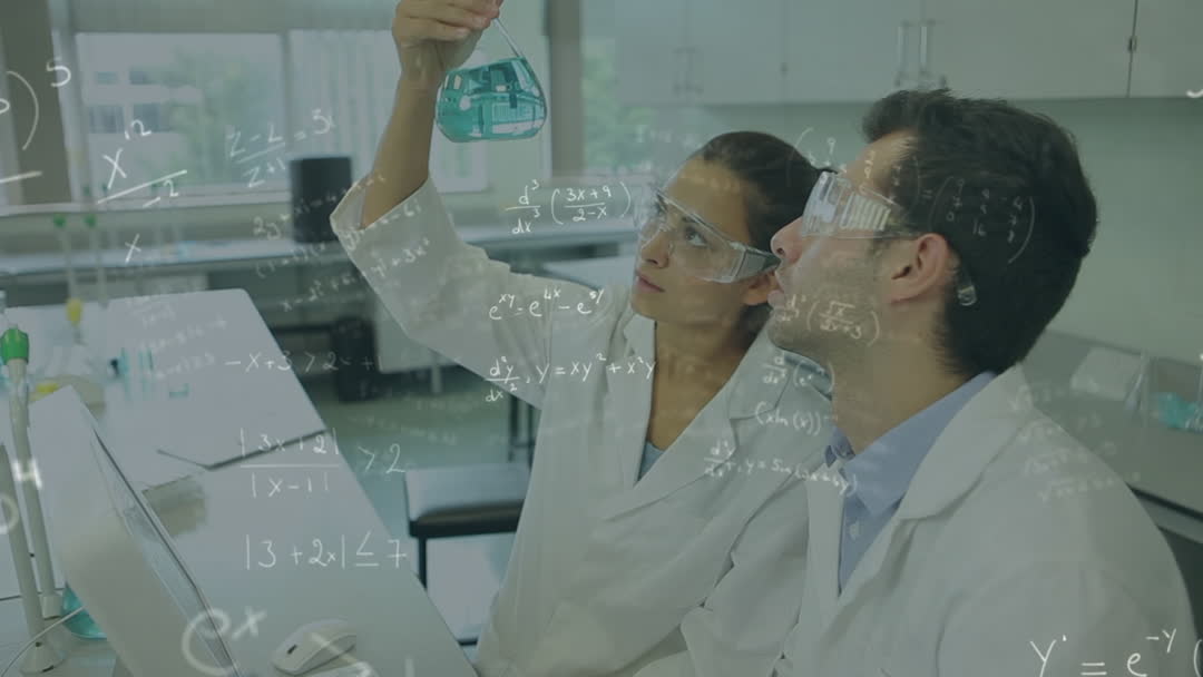 Scientists work diligently in a modern laboratory, surrounded by digital overlays of complex mathematical equations. This video reflects a global scientific environment and the pursuit of innovation and knowledge. Ideal for illustrating concepts in scientific research, biotechnology, STEM education, or technological advancements.