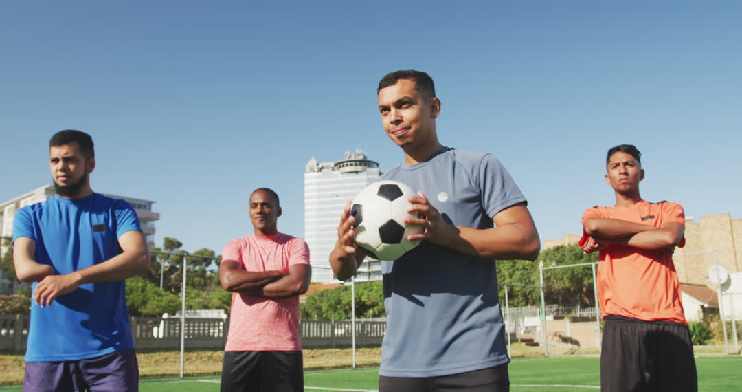 A diverse group of male soccer players stands united on a grassy soccer field under a clear blue sky. One player, who holds the ball, is highlighted in the foreground while others stand confidently with arms crossed. The video emphasizes inclusivity and team spirit, ideal for promoting equity in sports, athletic events, or advocating diversity and acceptance in advertisements.