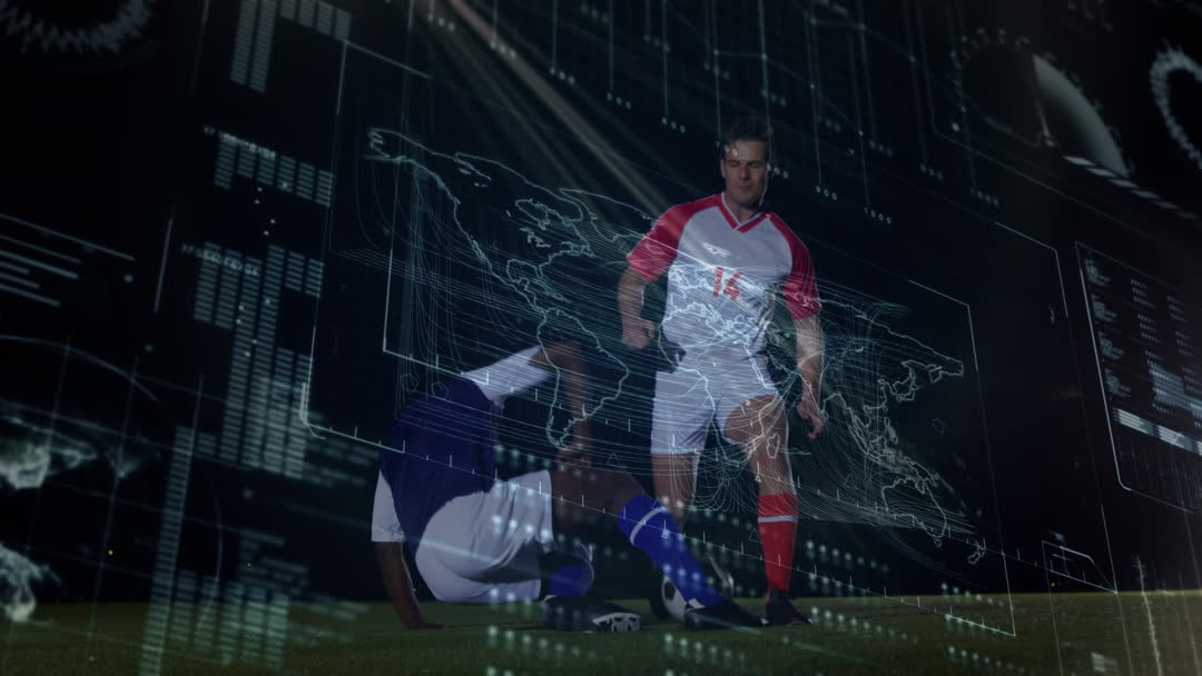 Soccer players engaging in an animated global scene with a digital data overlay in the background. This innovative setup blends sports with data analytics, showcasing the fusion of technology and athletics. Suitable for use in presentations about sports technology, data-driven sports strategies, teamwork, or illustrations on the role of innovation in global sports.