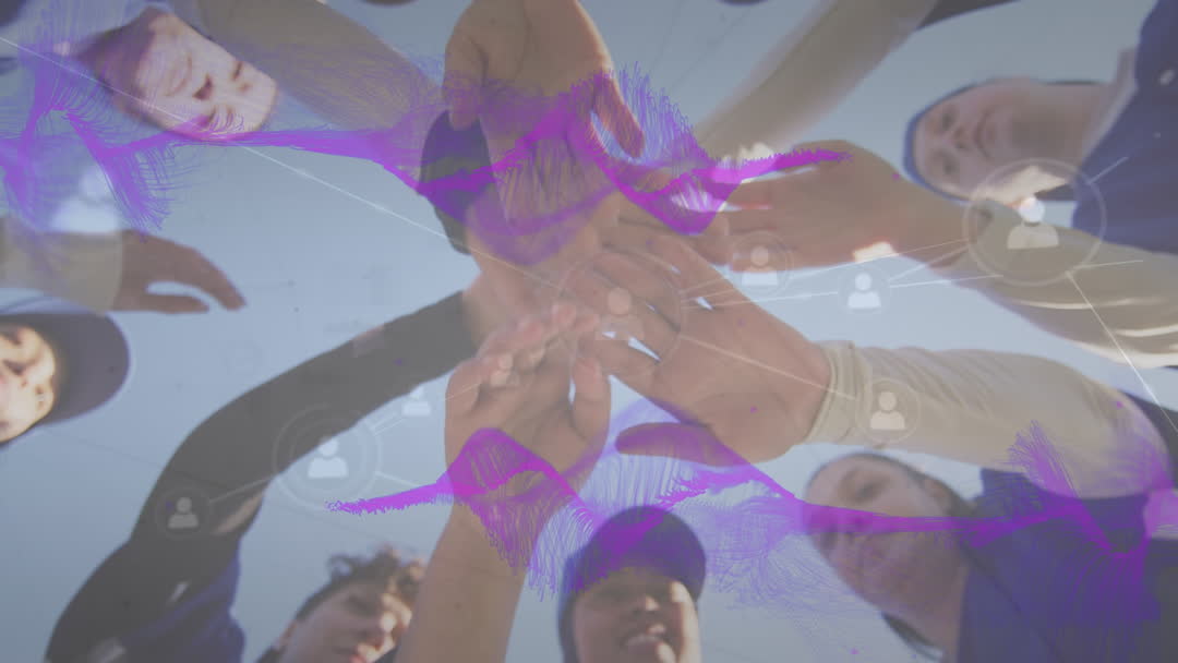 Group of diverse female athletes come together stacking hands, symbolizing unity and teamwork. Overlaid digital graphics suggest a focus on communication and technology in sports. Ideal for content on team building, digital connections in athletics, and sports management advancements.