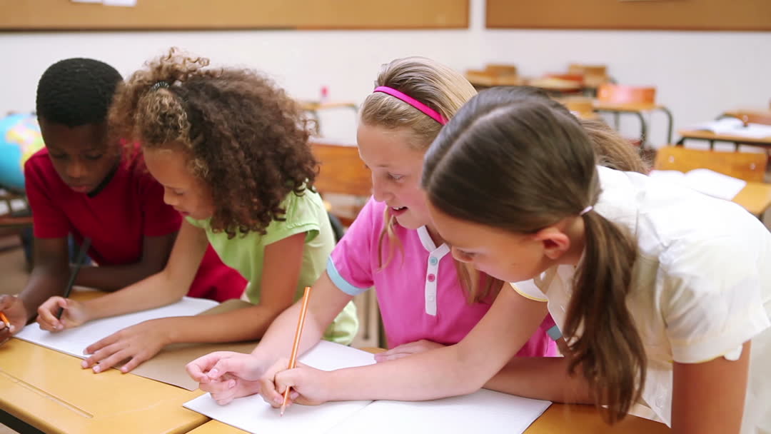Young students working together on a classroom assignment, promoting teamwork and diverse interaction. Ideal for illustrating educational materials, teamwork concepts, and diversity in learning environments.