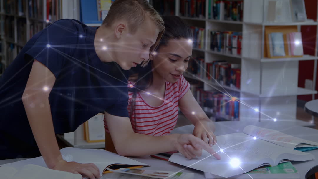 - Diverse Students Collaborating in Library with Digital Connections Overlay
