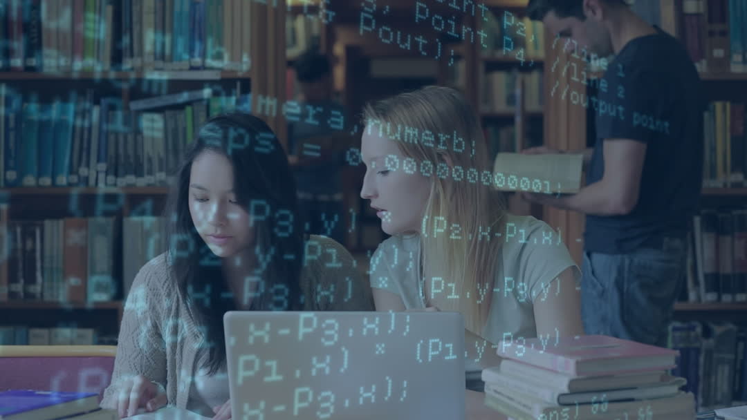 Two female students are collaborating and discussing while surrounded by books in a library as an overlay of digital data and coding scrolls over them. This scene demonstrates the integration of education with technology. It is ideal for illustrating concepts of digital learning environments, modern education, and the merge of STEM disciplines in educational settings.