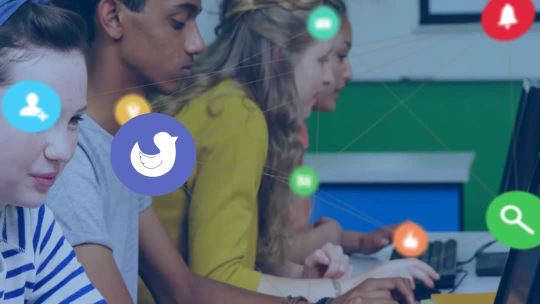 Group of students engaged in using computers, highlighting interactive and digital learning. Floating icons represent concepts of connection and collaboration in education. Ideal for illustrating technology-integrated education, teamwork, young tech learners, and peer learning environments. Suitable for educational and tech platform marketing, online courses design, brochure promotional material.