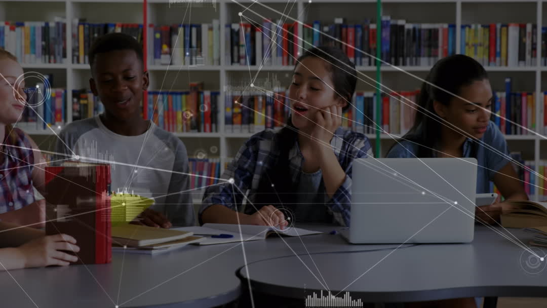 Group of diverse students are in a library, using a laptop and engaging in conversation. A digital overlay with connected dots and graphs suggests technological advancements in learning. Ideal for illustrating modern education environments, teamwork, technological integration in classrooms, and digital communication in academic settings.