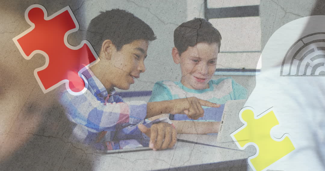 Two diverse students engaging with a digital tablet, fostering collaboration and creative problem-solving. Overlaid puzzle pieces symbolize teamwork and innovative thinking. Ideal for educational content, technology in schools, or articles about promoting collaboration in the classroom environment.